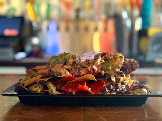 Corn chips covered with mixed cheese, black beans, jalapenos and pico de gallo. Topped with sour cream and guacamole. Vegetarian